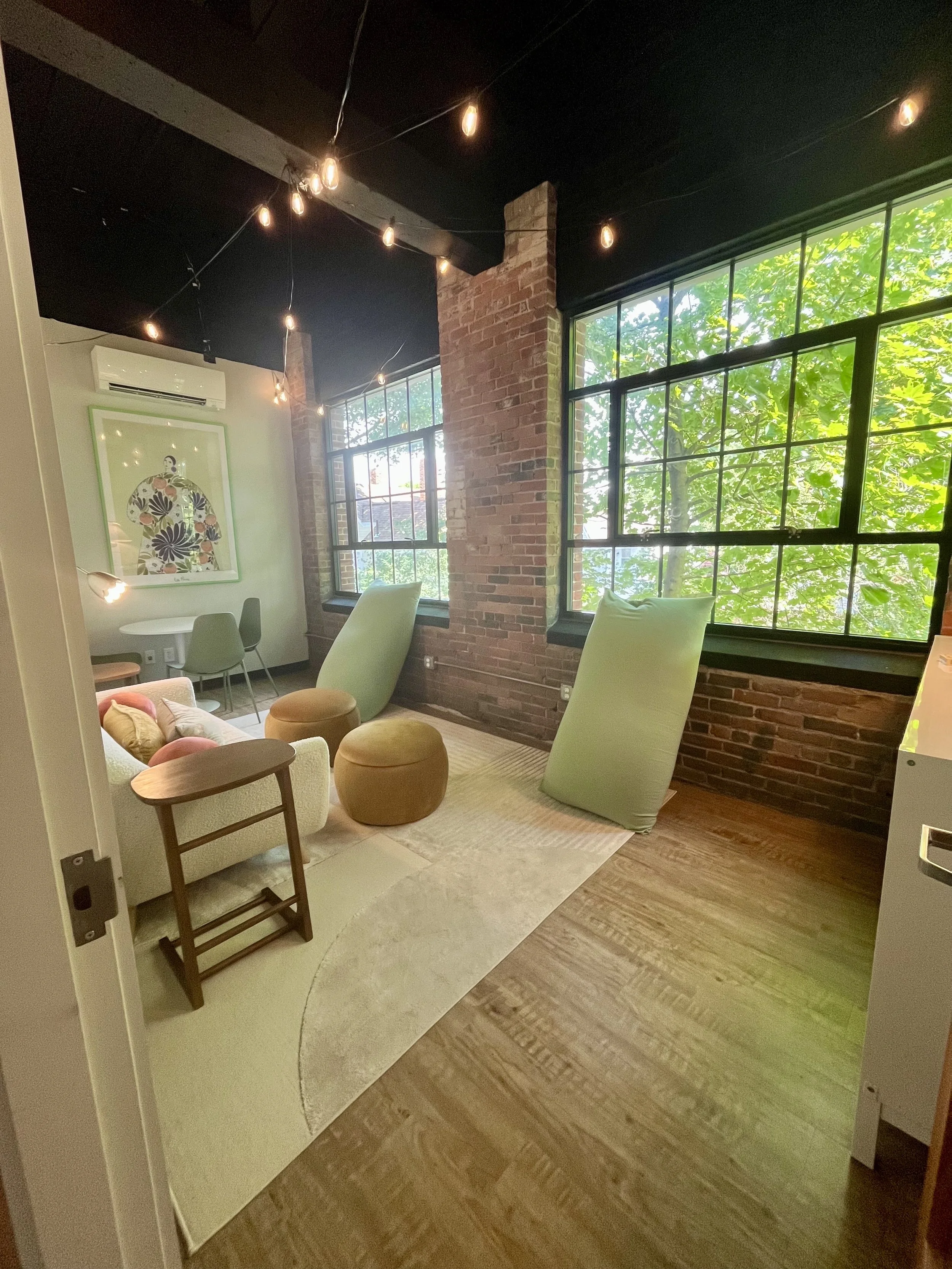 The Perch is a relaxed, cozy space featuring a small round table, sofa, beanbags, and a collection of books and games. It's perfect for focused work, casual meetings, creative brainstorming, or quiet reading. Members can sign up on the sheet outside the door. Non-members can rent the space by reaching out to Jodi or Crystal.