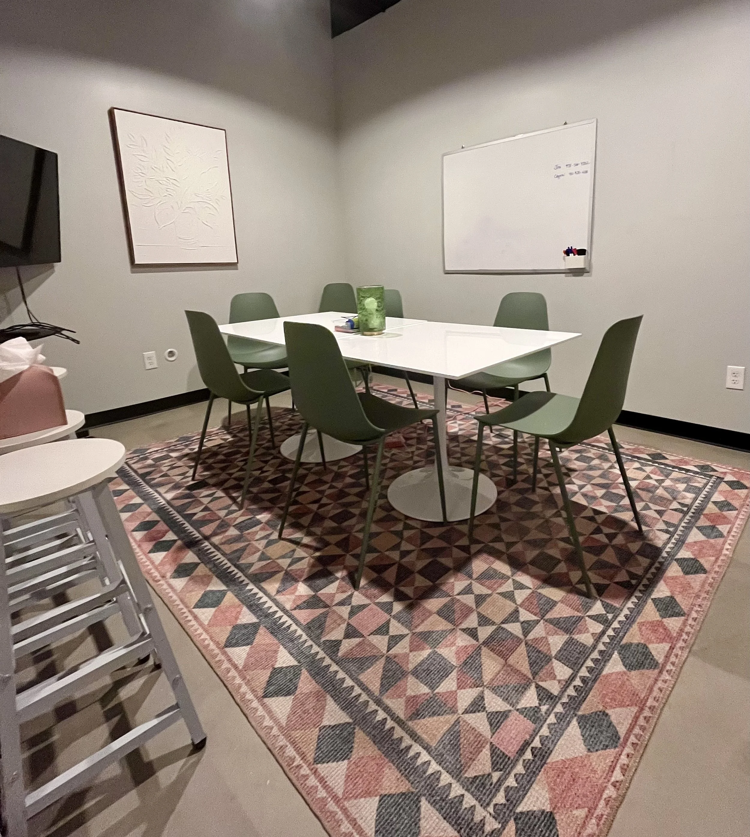 The Nest is a cozy conference room that comfortably fits 6–8 people. It includes Wi-Fi, a whiteboard, and a TV for projection—ideal for meetings or collaborative work. Members can reserve time on the sign-up sheet outside the door. Non-members are welcome to rent the space by contacting Jodi or Crystal.